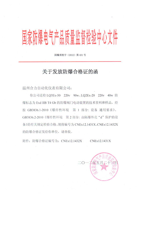 熱烈祝賀合力LQ系列防爆執行機構取得國家防爆證書2012年5月4日,我公司向河南省國家防爆電氣產品質量監督檢驗中心提交了我公司自主研發的LQ型防爆系列產品的相關技術資料。經過檢驗中心的嚴格檢驗,專家組一致認為我公司產品技術先進,技術文件與防爆檢測中心的審查確認···